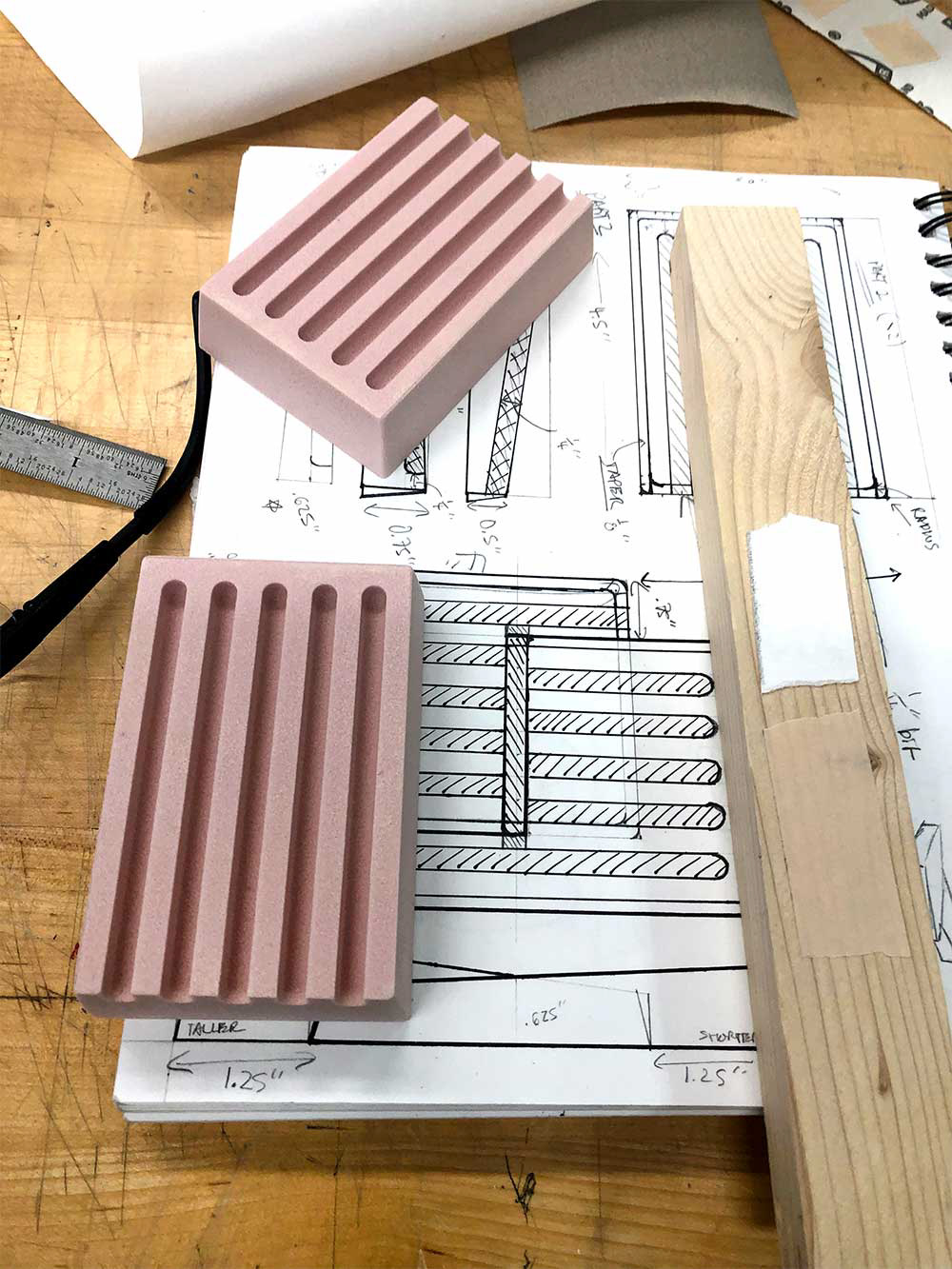 The mould was carved of 2 blocks of urethane foam on a 3 axis mill; drainage channels were first milled on each block, the trapezoidal slants cut, draft angles sanded, and finally both combined to form the final intersecting geometry